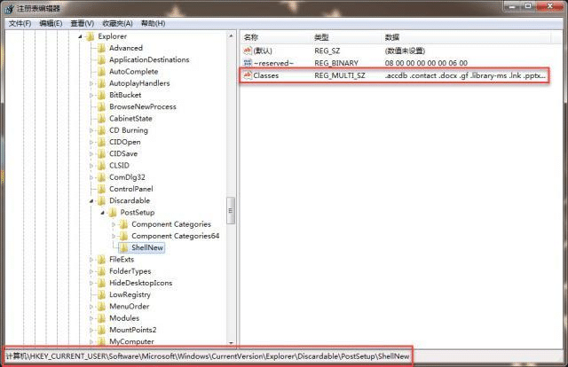 3. HKEY_CURRENT_USER\Software\Microsoft\Windows\CurrentVersion\Explorer\Discardable\PostSetup\ShellNew\Classes