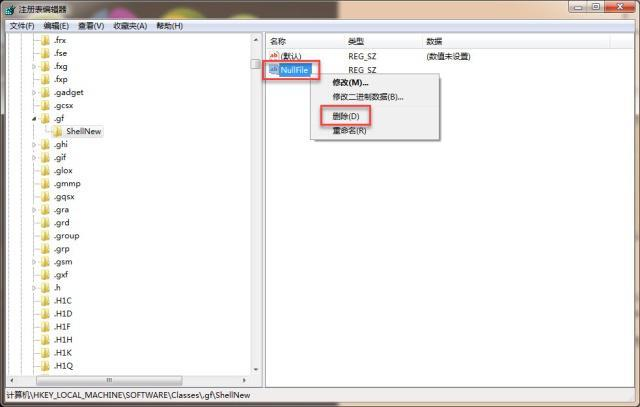 5. 按照以上步骤操作完成后,发现已经消失的残留项再次出现,说明软件卸载后,注册表未清理干净。请按照以下路径寻找【HKEY_CLASSES_ROOT\.gf\ShellNew】,右键单击【NullFile】,左键单击【删除(D)】。